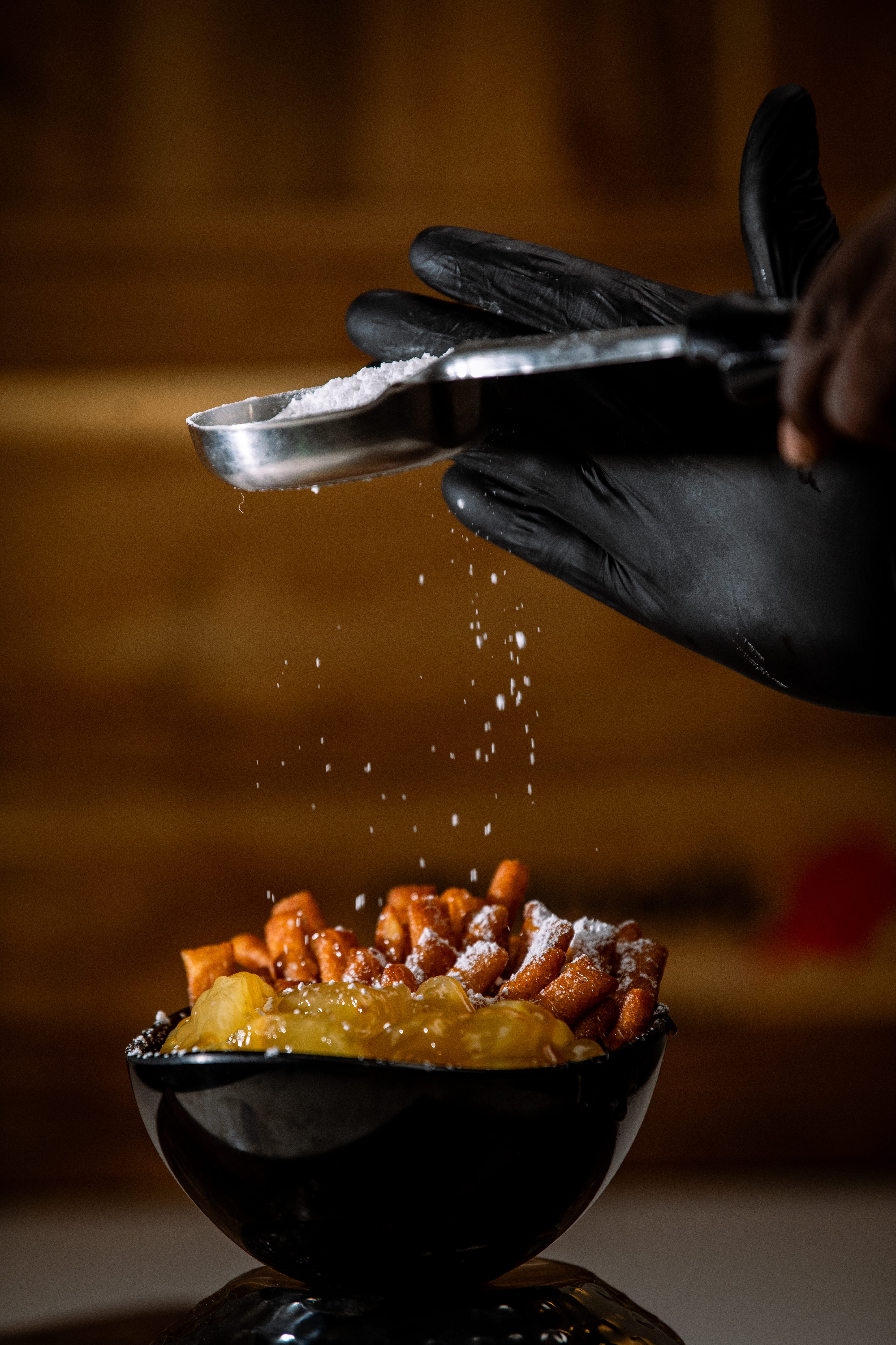 The uses for the funnel cake fries were straightforward. Use them sweetly and create a savory version where they substitute for traditional French fries.